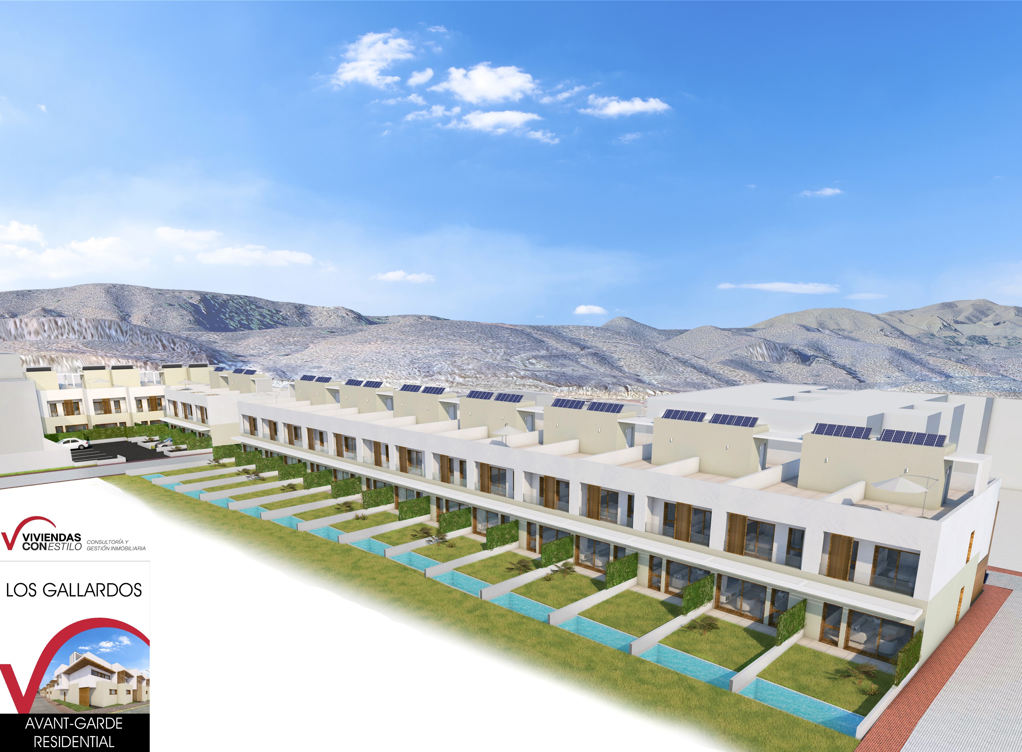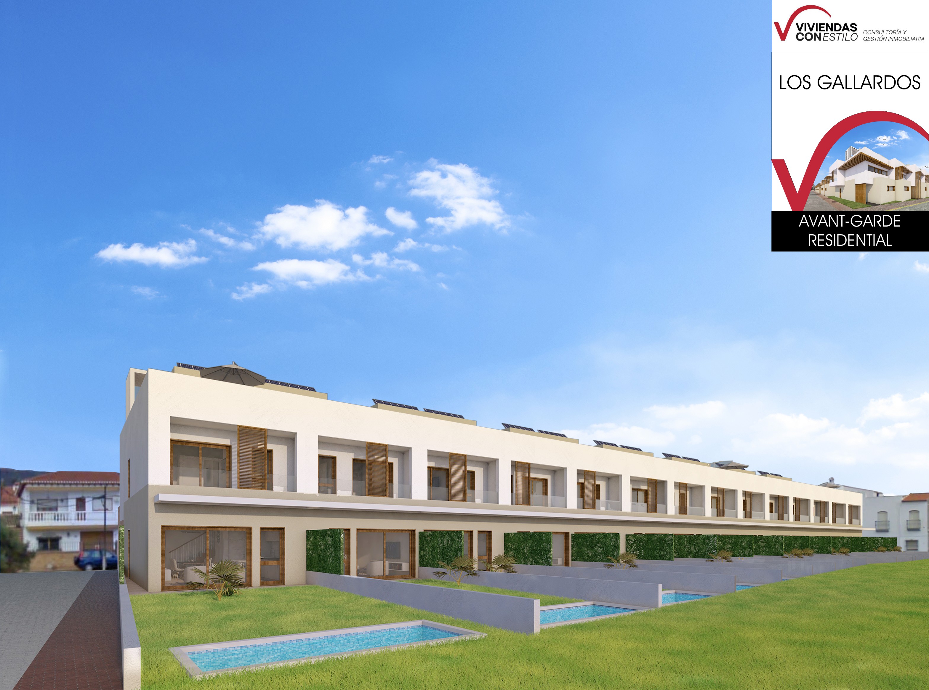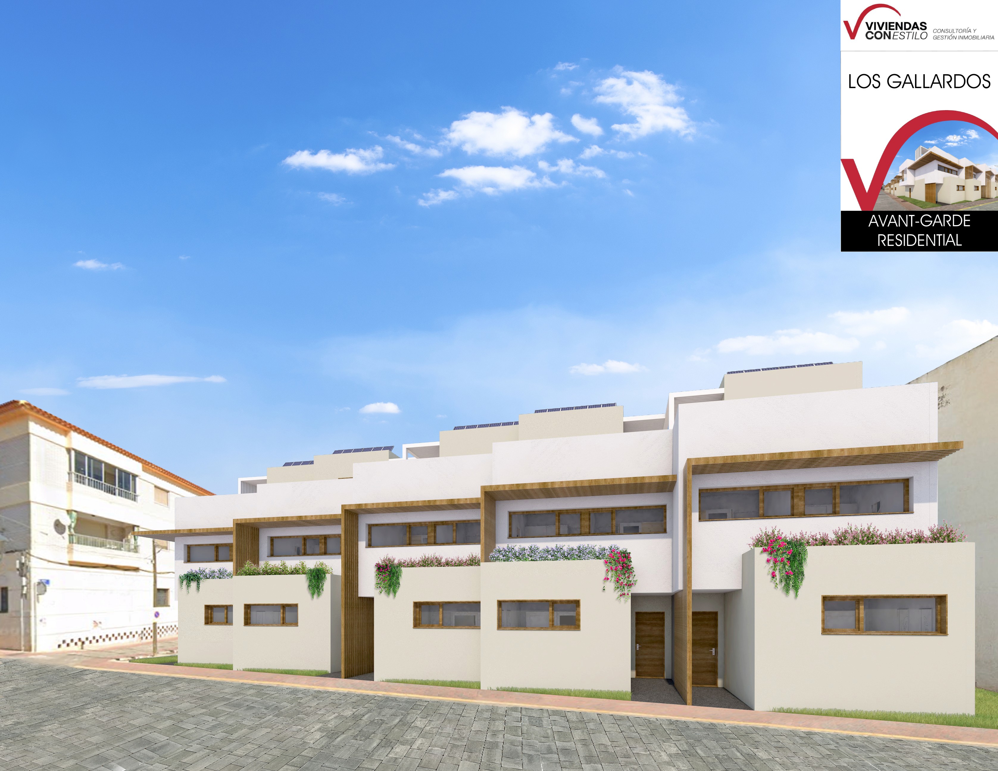 22 villas adosadas de 3 plantas con solarium, jacuzzi opcional y parking. Desde 188 m² en parcelas independientes.
